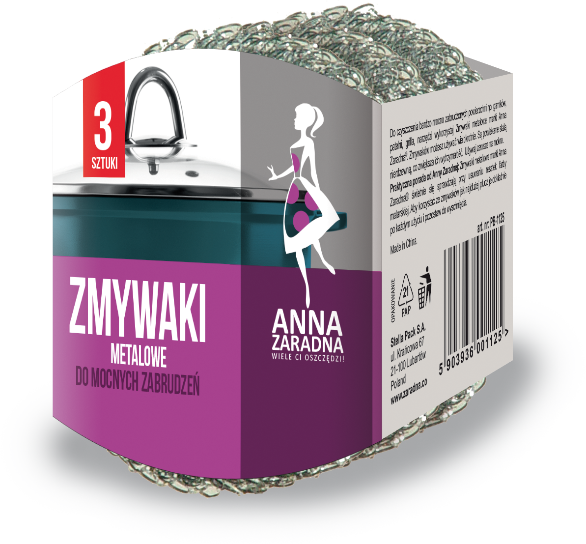 Do czyszczenia mocno zabrudzonych garnków i patelni wykonanych z aluminium, stali, stali emaliowanej lub żaroodpornego szkła użyj zmywaka metalowego Anna Zaradna. Innowacyjna formuła wykonania metalowego zmywaka sprawia, że nie rysuje czyszczonych powierzchni i nie rani dłoni. Zmywak sprawdza się idealnie przy bardzo trudnych zabrudzeniach, np. przypalonym i zaschniętym jedzeniu ale także przy czyszczeniu mocno zabrudzonych powierzchni np. grilla, narzędzi, usuwania resztek farby malarskiej.